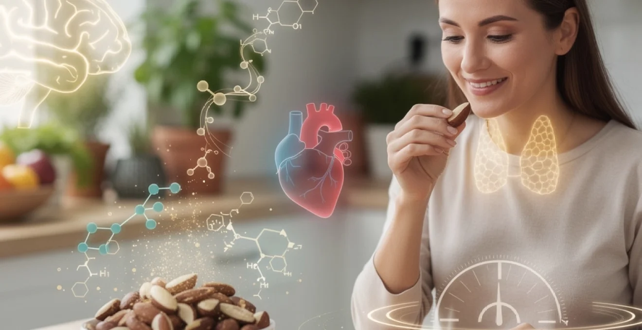 Le sélénium joue un rôle fondamental dans plus de 25 sélénoprotéines différentes, des enzymes essentielles à votre métabolisme cellulaire. Contrairement aux compléments alimentaires synthétiques, le sélénium contenu dans la noix du Brésil se présente sous forme de sélénométhionine, une forme organique hautement biodisponible que votre organisme assimile avec une efficacité remarquable. Cette biodisponibilité supérieure explique pourquoi une seule noix peut suffire à couvrir vos besoins quotidiens en cet oligo-élément critique.